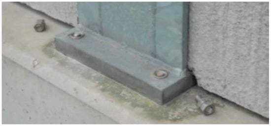 Figure 2 presents the main components of a NB structure: first, the noise barrier panels (e.g., made of aluminium or concrete), which protect the surrounding areas from excessive noise pollution; second, the steel posts (typically an I-beam HE-A, HE-B, or HE-M), which are fastened to the concrete edge beam and are thus the most important part for the aerodynamic load transfer to the third part, the concrete edge beam; the fourth and most important component of the NB structure is the fastening system, as it is responsible for the overall safety and stability of the NB. A steel baseplate is welded to the lower end of the steel post, and four threaded bolts, which are concreted into the concrete edge beam, are used to anchor the NB system to the concrete edge beam. Due to the aerodynamic load, material fatigue can occur in principle in many different construction details of the NB.