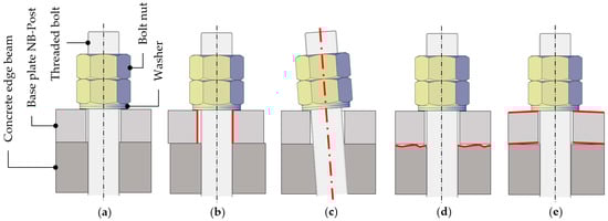 In general, bolted connections usually show a fatigue failure in the first loadbearing thread due to the contact conditions and the notch effect resulting from the geometry of the thread []. Failure in bolted connections of NB steel posts behaves more or less the same way as shown in Figure 6. In the case of ideal installation conditions, the NB fastening elements are tensile stressed and highly preloaded to avoid gaps between the steel baseplate and the surface of the concrete edge beam. In the case of NB steel posts, ideal installation means that the threaded bolts are subjected to no or negligible bending stresses and show sufficient preloading. A deficient installation condition, on the other hand, can be an insufficient preload force, missing washers, the inclination of the threaded bolt, displaced baseplate, rough or deformed concrete edge beam surface or steel baseplate surface. What all deficient installation conditions, except not necessarily insufficient preload force, have in common, is the induction of bending stresses in addition to the axial tensile stresses.