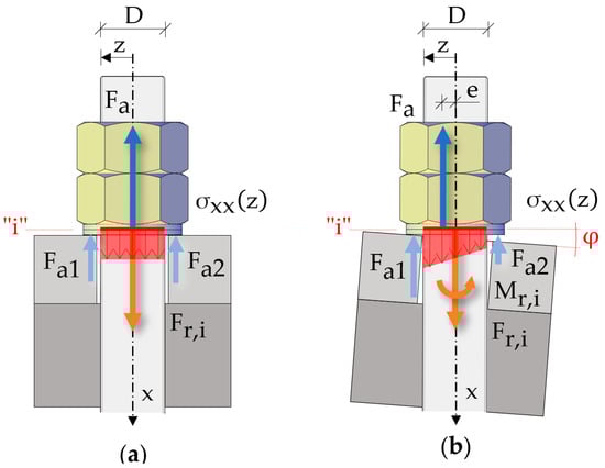 The effect of the eccentric load resulting from each deficient installation condition is shown in Figure 8a,b in an analytical way, where (a) is an ideal installation condition, and (b) is a deficient installation condition with an inclination of between the threaded bolt and the baseplate. When applying the preload force in an ideal installation condition of the steel post, the resulting action force is centred; thus, the fastening system is just reacting with a normal (axial) force but not with a bending moment. This means the preload force can be seen as a uniformly distributed stress on the lower side of the screw nut where the first loadbearing thread engages (Figure 8a). In this idealised two-dimensional static system, this load is simplified via the two forces, Fa1 and Fa2, with equal magnitude and equidistant from the bolt axis. Since the cross-section of interest “” is engaging at the first loadbearing thread, the calculations of the internal forces are conducted at exactly that point. The action force , which is centred in the case of ideal installation condition, results from the sum of Fa1 and Fa2 and equals the resistance force at the cross-section of interest via the equilibrium of forces. When the internal forces have been calculated, finally, the preload stress is calculated with Equation (5), where is the area of the cross-section of interest. Since the forces act centrically, the bending stress term is omitted in Equation (5), leaving only the stress term of the normal force.
