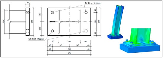 The analyses of the resistance side were carried out via the application of the finite element software Abaqus 6.23-1. The linear finite element model was built on the basis of the new noise barrier design of the Austrian federal railways (Figure 9). The NB components modelled with Abaqus and briefly described in Section 2 are the C 20/25 concrete edge beam, S 235 JR steel baseplate with a thickness of 30 mm, S 235 JR I-beam of type HE-A 200 with a length of 1 m, four A4-80 threaded bolts with dimension M20, and four washers in between screw nut and steel baseplate. The threaded bolts and the nuts were modelled as one part for the sake of simplicity.