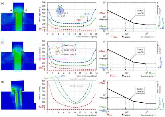 Figure 10a illustrates the ideal installation condition of the NB steel post on the concrete edge beam, (b) the installation condition with the displaced steel baseplate, and (c) the installation condition with the inclined executed threaded bolt. For each installation condition, three different cases of preload force (100 kN, 60 kN, and 0 kN) were applied. The choice of preload force is based on experiments given in []. As in the stress analysis, as shown in the middle graph of Figure 10a–c, the first case with 100 kN preload force is depicted in blue, the second case with 60 kN preload force is depicted in green, and the third case with 0 kN preload force is depicted in red. The stresses that are shown correspond to the path 0.0–17.7 mm in cross-section A-A, as the graph in the middle of Figure 10a illustrates. Note that the dimension of the threaded bolt is chosen as M20. This path is orthogonal to the main bending direction and represents the significant case. Point 0.0 mm is oriented towards the I-beam, and point 17.7 mm is oriented away from the I-beam. Every case of preload force inhabits three load steps (load step 1: applying preload force, load step 2: applying external bending moment +10 kNm, load step 3: applying external bending moment −10 kNm). Therefore, three stress curves are the result of the numerical calculation. Since the scale of the stress curves does not allow to make this clearly visible, except for the case of 0 kN preload force, a zoomed-in few of the cases with preload force 60 kN are shown in Figure 10b in the middle graph. The case with preload force 100 kN behaves similarly only for the case with preload force 0 kN the stress curve of load steps 1 and 3 drops down to zero, which leads to the highest stress variation range out of all three installation conditions.