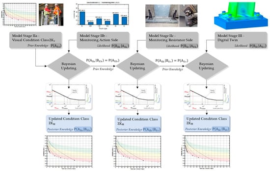 With increasing Model Stages I to IV of the preceding holistic approach, there is a continuous increase in information, whereby this newly acquired information is also accompanied by uncertainties. It is, therefore, obvious to needle the increasing information of model levels I to IV with Bayesian updating procedures, as shown in Figure 11. Among other things, the Bayesian updating procedure not only allows the assessment from the visual inspection to be detailed but also allows the reliability level and the remaining service life to be assigned to the visual inspection results by including digital twin approaches and Wöhlerline formats, as shown in Figure 11 [,,,,].