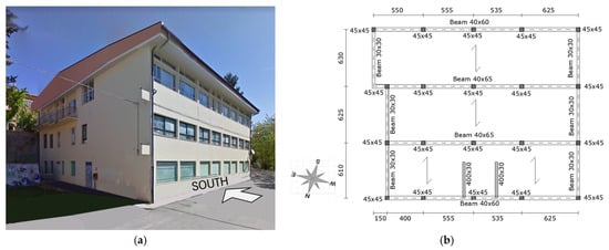 The case-study school building: (a) photo of the building, (b) first storey’s structural plan.