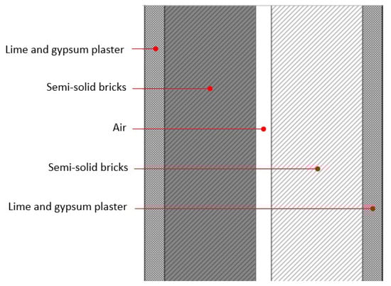 As with most of the existing Italian buildings built before the enforcement of the first energy saving law [], the envelope of the building at hand is provided with low thermal resistance, imposing high energy demands for heating and cooling the classrooms. In fact, the vertical infill walls (with a total thickness of 300 mm) are made of two 115 mm thick layers of semi-solid bricks with a 20 mm air gap, resulting in a total thermal transmittance (i.e., U-value) equal to 1.031 W/m2K (Figure 2). The intermediate floor slabs are made up of mixed brick-reinforced concrete joists (240 mm thick) complemented by a lightweight concrete creed and stoneware tiles (leading to the total thickness to 300 mm) with a total U-value of 1.353 W/m2K. The roof slab is made up of 160 mm thick brick elements with a 40 mm concrete plate completed by two plaster layers (internal and external) 20 mm thick with a total U-value equal to 1.149 W/m2K. The windows are made of two 4 mm glass layers with an air gap of 12 mm, which have a U-value equal to 2.849 W/m2K.
