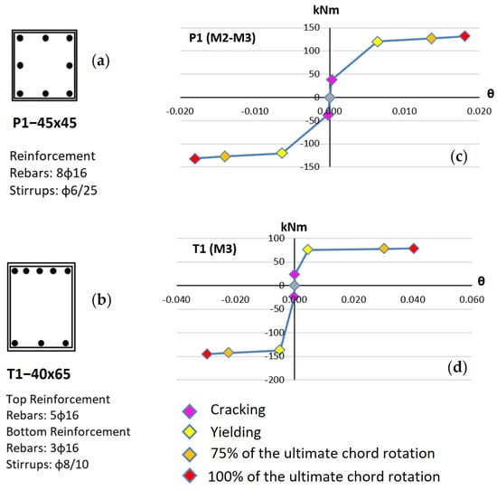 Plastic hinge modelling of column (P1) and beam (T1): (a) column’s reinforcement details; (b) beam’s reinforcement details; (c) column’s moment–rotation relationships; (d) beam’s moment–rotation relationships.