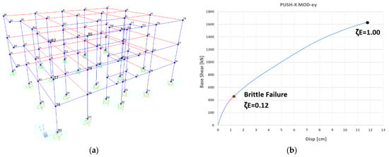 (a) Structural model; (b) push-over analysis in the X-direction of the ante-intervention condition (as-built). ζE = 1 represents the full retrofit condition.