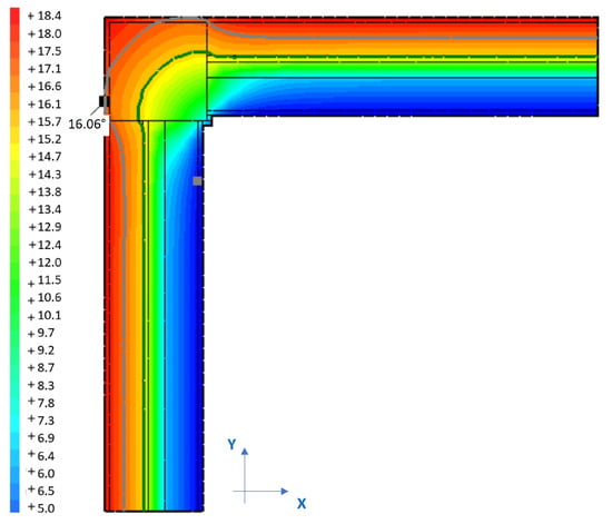 FEM modelling of thermal bridges at column–infill corners (temperature in °C).
