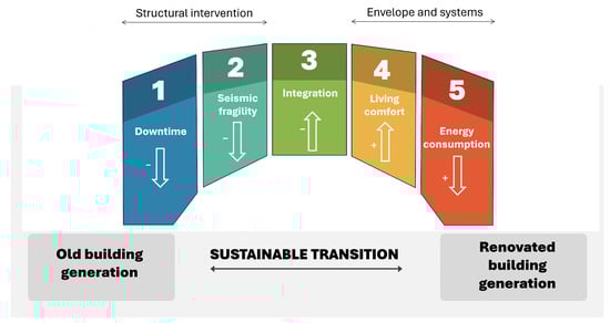 Therefore, the design of renovation interventions on public buildings should be based on the following five stones that are able to act together, providing a sustainable transition to the new generation buildings (Figure 8):
