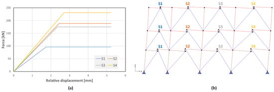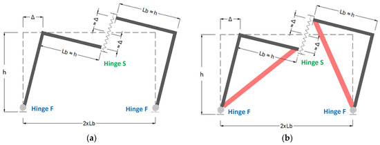 The HPDF system’s effectiveness increases when the framing elements’ stiffness increases. To maximise the relative displacement of the S hinges, small or negligible deformations of the beams are required. This aspect is significantly related to the span length of beams, and could limit the applicability of the HPDF in some cases (large spans). In order to avoid using large cross-sections of beams and columns, additional braces can be used to increase the efficiency of the system (Figure 9b).