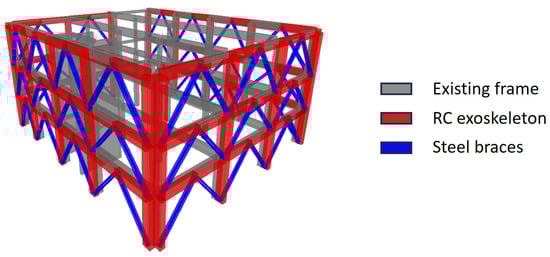 The connection between the HPDF system and the existing structure must be present only at beam–column joints, in order to allow a rigid body behaviour of the new frames with respect to the existing ones. For the building at hand, the arrangement of Figure 9b was used due to the presence of large spans in the framed structure that forced the adoption of measures to reduce the exoskeleton deformability. Figure 10 shows the FEM model in SAP2000, provided with exoskeleton RC members (in red), bracing steel elements (in blue) and existing RC members (in grey).