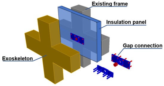 These two plates are connected by a steel cylinder that assures pin restraint between the existing and new structure, permitting free relative rotation. The gap dimension (distance between the old and new structure) is equal to 80 mm (Figure 14). Out of these 80 mm, 50 mm are used to accommodate the presence of insulation panels, and 30 mm are necessary for the presence of the exoskeleton’s formworks (during construction) and to easily remove them after concrete curing. Therefore, the working phases for the seismic–energy intervention are as follows:
