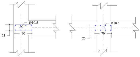 As the main novelty proposed in this concept technique, at each beam-column joint location the exoskeleton and the existing frame are connected through a purposely developed steel connection that allows for the integration with the thermal insulation intervention. In more traditional exoskeleton solutions, new frame elements are rigidly connected to the existing structure along the entire length of each element, as, for example, in the case of non-dissipative solutions []. On the contrary, exoskeletons based on the HPDF solution must be connected only in beam-column joints through a device that is able to allow for relative rotation between the existing and new members (according to Figure 12). Moreover, the existing and new elements must be separated by a gap that permits the installation of insulation material. For this reason, the connection (named “gap connection”) is conceived specifically to fulfil these two requirements assuming the shape of a pin connection with an 8 cm gap between the existing and new RC members (Figure 12). The gap connection is made up of two main steel plates (Figure 13) that are anchored to both of the concrete structures through bolted rods.