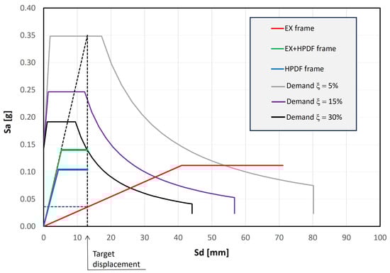 First of all, the nonlinear static (pushover) analyses have to be carried out on the as-built model of the existing structure using a suitable load pattern (e.g., Ref. []). The modal participation factor is adopted to convert the MDOF response into the SDOF response, obtaining the corresponding bilinear curve in the acceleration–displacement response spectrum (ADRS, red curve in Figure 15).