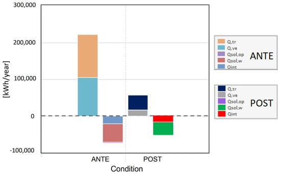 In Figure 18, the energy balance for heating is reported for before and after the energy efficiency assessment. The results show the relevant reduction in the transmission losses due to the thermal barriers.
