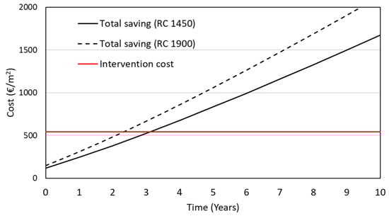 Based on Figure 19, the payback time (intersection of savings over time and intervention cost curves) is equal to about 3.2 y for the case of RC = EUR 1450/m2, and 2.3 y for the case of RC = EUR 1900/m2. As expected, the higher the reconstruction costs, the shorter the payback time. It is worth stressing that most of the savings that yield such short payback times are due to the huge seismic savings, being 7.1% of RC each year. Figure 20 shows the amount of EAL and energy savings for the first ten years, for a case where the reconstruction costs are equal to EUR 1450/m2.