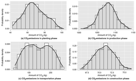 Bamboo emissions by phases in (a) planting phase, (b) production phase, (c) transportation phase, and (d) construction phase [27].