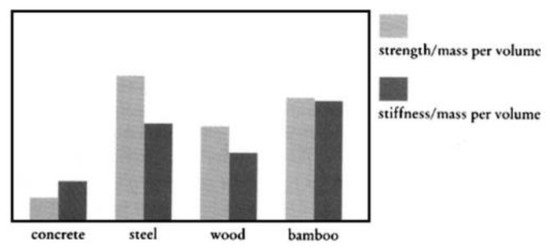 Bamboo culm has been treated before application as construction materials such as scrimber [58], plywood [59], panels [60], lumber [61], and laminated [33]. Bamboo products can compete with other railway sleeper materials such as concrete, wood, and steel because they have high strength and stiffness compared to their weight [62]. As shown in Figure 6, stiffness and strength divided by mass per volume of four common construction materials, such as concrete, steel, wood, and bamboo, are compared. Bamboo shows higher performance compared to concrete and wood in terms of stiffness/mass per volume and higher strength than concrete, steel, and wood in terms of strength/mass per volume. In the following sections, more specifications are presented about bamboo products.