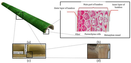 Bamboo exhibits a hollow internal structure with tube-like sections between the nodes, where longitudinal fibers are aligned within a matrix of lignin (see Figure 7a) [64,65]. The thickness of the culm wall gradually decreases from the base to the top of the bamboo culm [66]. The slender bamboo fibers, which are long, tapered at both ends, and sometimes forked, also vary in density within the culm wall, with a decrease in density from the outer wall to the inner wall [67]. A cross-section micrograph of bamboo is presented in Figure 7b. Based on the distribution density of longitudinal vascular bundles and corresponding chemical components, bamboo can be divided into four components: the outer layer, the fresh layer, the inner layer, and the nodal area (Figure 7c,d). The size of the vascular bundles gradually increases from the outer layer to the fresh layer, reaching its maximum size in the inner layer [68]. Consequently, the mechanical strength of bamboo gradually decreases from the outer to the inner regions [69]. The high density and hardness of the outer layer make it difficult to compress, while the softness of the inner layer makes it prone to stretching and cracking [70].