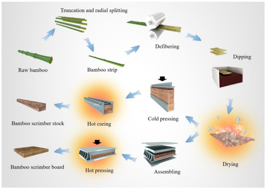 In response to the growing industry and demand for sustainable construction products, bamboo is being utilized to create engineered bamboo composites, which aim to standardize the shape and reduce material property variations [92]. One specific type of engineered bamboo composite is bamboo scrimber, which involves crushed bundles of bamboo fibers saturated in resin and compacted into a dense block [93]. This rectangular structural element possesses exceptional qualities, including a high bamboo utilization ratio (over 80%), an appealing grain pattern, and similar hardness and color to that of hardwood [94]. These characteristics make bamboo scrimber a competitive option among commonly used construction materials [95]. The production process of bamboo scrimber typically involves several steps, as illustrated in Figure 9. These steps include truncation and splitting of bamboo, softening, removal of the bamboo’s outer skin, drying, sizing, assembly, and hot-pressing [72]. However, with advancements in technology, certain steps have been omitted in the large-scale production of bamboo scrimber [96]. The main processes involved now include truncation and splitting, defibering, drying, dipping, assembly, cold-pressing, and heat curing or hot-pressing [97].