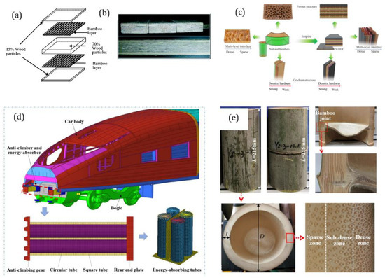 (a) Preparation and (b) cross-section of a real composite sleeper, (c) process to produce a bamboo laminate composite for the flooring of railroad cars, (d) application of energy-absorbing CTs in rail vehicles, and (e) bamboo samples and the detailed structures [71,77,98,100].