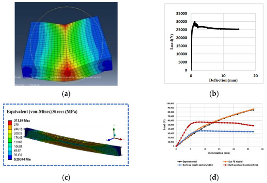An overview of bamboo numerical modeling: (a) FEM modeling of bamboo slab, (b) load-deflection results of concrete slab reinforced by bamboo [79], (c) FEM study of a bamboo–steel composite beam, and (d) load-deflection results of different types of bamboo–steel composite [109].