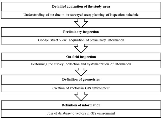 In general, updated knowledge of road assets status is a crucial factor for safety matters and a major duty in the charge of road conservation stakeholders is the collection of data for routine and periodic maintenance works [32,33,34,35,36]. Furthermore, with regard to European countries, the need for periodic inspection and audits is established from a normative point of view [37,38,39]. In contrast, costs associated to collecting data are a main drawback [24,40], so awareness of asset conditions is essential when allocating funds [36], and agencies should find an adequate and reasonable balance between level of safety and costs [41,42]. Despite the lack of common standards [43], there is a wide variety of approaches in surveying road assets and applicable technologies [44], and the latter are often integrated [45]. Surveying aim can include the collection of spatial information or the production of a detailed cadaster. Regarding the operational implementation of surveys, methodologies range from visual inspections to sensor-based automatic investigations, allowing faster collection of information. In order to optimize the survey, a combination of the previously mentioned methods could be applied [19]. With regard to the first category, visual inspections are defined in [33] as manual measurements operated by personnel walking or slowly driving along roadways. While in [46,47,48], it was argued that visual methods are slow, cumbersome, labor-intensive and time-consuming, in [33,49] it was highlighted that they are quite easy to learn, require simple equipment, and provide data of sufficient quality for most decisions and applications. Automatic surveys evolved in parallel to the development of solutions, such as remote sensing technologies [50] as well as artificial intelligence [51] and deep learning techniques [52] that allow an easier and quicker data collection, with growing efficiency in terms of effectiveness [53]; today, they are preferred to manual surveys [54].