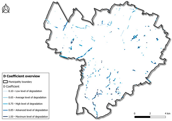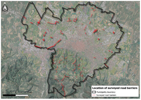 This section delves into the evaluation and discussion of the main survey outputs. In general, and “Asset deterioration depends on factors such as environmental conditions, design characteristics and utilization level, with immediate impacts on operating costs, as argued by [3]”, namely the diagnostic phase, during which investigations are needed to best plan the mitigating strategies. Figure 4 shows the localization of surveyed barriers within the municipal boundaries, while Table 5 reports the main characteristics of surveyed barriers. As the first, albeit presumable result, most of the barriers were surveyed outside the denser urban areas. In fact, most of them are located in the extraurban or hill zones of the municipality, where roads are less straight, although maximal speed is usually higher, and hazardous topography (i.e., slopes, cliffs, hillsides, etc.) plays a crucial role in road safety concerns. With regard to qualitative outputs, Section 3.1 describes the typological overview of barriers, while Section 3.2 focuses on indexes.