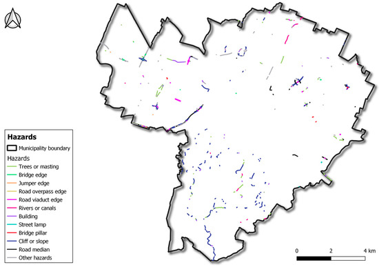 Globally, eleven different recurrent hazards were surveyed: bridge edge; bridge pillar; building; cliff or slope; jumper edge; rivers or canals; road overpass or viaduct edge; road median; street lamps; trees or masting. They are represented in Figure 7. Infrequent hazards (i.e., f < 3) were surveyed as ‘other hazard’. Topography and road network characteristics affected the hazards’ protection and hence coefficient F, which is represented in Figure 8. In fact, the most hazardous areas were located and detected in the hill zones, where the roads run along ridges and gullies (‘calanchi’), a known peculiar character of Apennines in Bologna, or close to cliffs and slopes. In plain areas where most of the built areas are located, hazards are related to anthropic activities and alteration to environment, such as buildings and bridges. In particular, overpasses and viaducts over the Bologna ring road, as well as the main two-lane urban arterials such as Viale Togliatti, Via Nuova Bazzanese and Viale Pertini, were surveyed. The overview of barrier classification according to coefficient F is reported in Table 7.