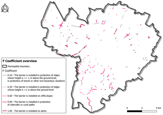 As briefly mentioned above, with coefficient F, location and reasons for installation were identified. The attribution of this coefficient is essential when estimating the environmental effect of degradation. In fact, due to different locations (e.g., alongside a highway, upon a bridge, etc.), the heterogeneity of road barrier age and characteristics and the presence of surrounding objects and hazards (e.g., buildings, trees, etc.) the residual overall functionality of a barrier could vary. Table 2 shows coefficient F descriptions per each value.