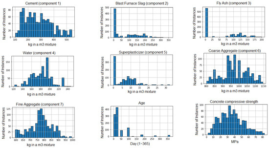Ordinary Portland cement, water, coarse aggregate, fine aggregate, superplasticizer, blast furnace slag, and fly ash are the seven elements in the tested concrete specimens, which were cured under laboratory conditions. The specimens indicated in the below table did not contain any superplasticizers, blast furnace slag or fly ash. The concrete’s compressive strength was then determined using a standard compressive test procedure on cylinder specimens with a height of 300 mm and diameter of 150 mm (ASTM C470/AASHTO M 205). The experimental data sets contain a total of 9 parameters. Table 1 shows the name, unit, min/max values, mean value, and standard deviation (SD) of the experimental parameters. Furthermore, the statistical distribution of the concerned values is given in Figure 1, which allows us to observe the parameters directly.