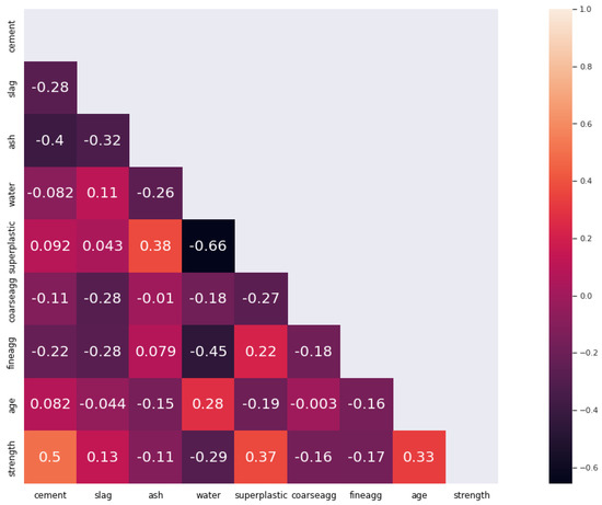 In this study, a prediction model for the compressive strength of superplasticizers was developed using 16 supervised learning methods from machine learning to address the high-dimensional complex non-linear relationship between the superplasticizer mixing design and the compressive strength of concrete. Using Yeh’s concrete study [15,16] dataset, the prediction of concrete’s compressive strength was carried out with great accuracy. After conducting a statistical analysis of the dataset, a correlation analysis was performed. According to the findings, cement was the biggest influence on concrete’s compressive strength, followed by the superplasticizer additive, as seen in Figure 2. This supports the finding from Salahaldein Alsadey et al. [13], i.e., that adding superplasticizer boosts concrete’s compressive strength at all ages. The hydration process is not only not interrupted but also greatly sped up by the excess water created by the deflection of the cement particles, since the addition of a superplasticizer offers more water to mix concrete. Consequently, increasing the superplasticizer dosage will cause the cement to become more hydrated by trapping more water. The suggested usage of a superplasticizer has a limit, despite the fact that it boosts compressive strength. Superplasticizers will only reduce compressive strength if used in excess of what is recommended. The extra superplasticizer is the root reason because it separates the grain from the concrete, reducing the homogeneity of the concrete. As a result, the compressive strength of concrete diminishes if the dose utilised exceeds the ideal dose [29].