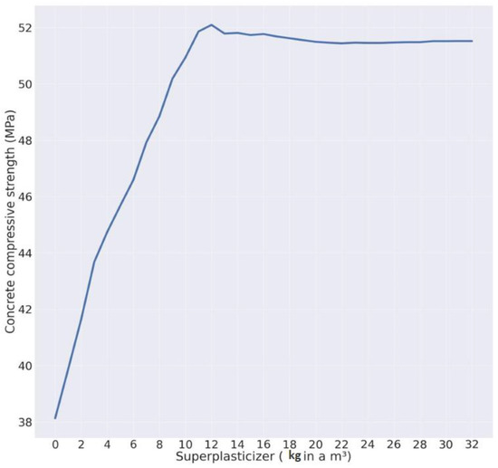 Surprisingly, no long-term decline in resistance has ever been observed. In actuality, the compressive strength of the concrete sample improves with age and increases with the length of time it has been in existence [32]. In this investigation, there was no proof that older concrete containing superplasticizers lost any strength. The results, which are depicted in Figure 5, indicated that the amount of superplasticizer additive that improves concrete’s compressive strength causes an increase of up to 12 kg for the concrete samples taken into account for this study. From this point onward, the compressive strength of concrete decreases slightly (by about 1 MPa). However, even when the superplasticizer content is increased to 32 kg per cubic meter of concrete, the concrete’s 52 MPa compressive strength stays constant. Because the concrete samples used in the dataset under study were taken at a young age, such as three days, and the concrete had not yet reached a high resistance, the concrete sets and reaches its ultimate strength later, when the amount of superplasticizer consumption exceeds the optimal amount. As a result, the chart started to trend downward in some areas. Superplasticizers reacted with C3A, one of the primary components of Portland cement, whose hydration was inhibited, despite the lack of a precise explanation for how they work [33]. Ettringite crystals begin to develop as small, roughly cubical particles rather than needles as a physical result of this. The mobility of the cement paste is enhanced by the cubic form of the particles [34].