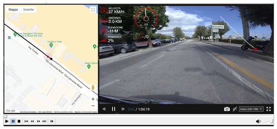 Nowadays, easy and cheap methods, supported by verbal descriptors [], can also be used to measure the International Roughness Index (IRI) and bumps (ASTM E 1926-98) on specific routes using selected applications for smartphones [,]. Data can be exported as reports, working sheets or spatial information and, once again, implemented in a GIS database. Spatial-referred video recordings allow emergencies to be identified, as well as road humps to be detected and decoupled from road roughness assessment. In this case, emergencies can include every localized distress and damaged or dangerous road elements (road sign, curbs, hydraulic systems, etc.).
