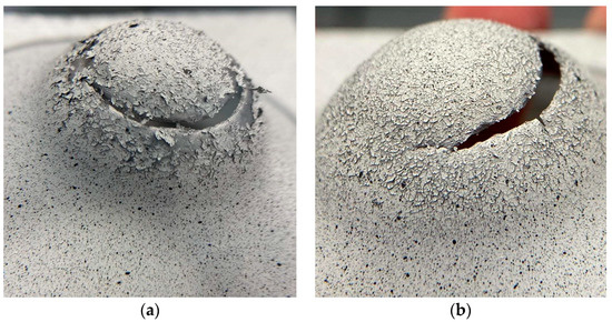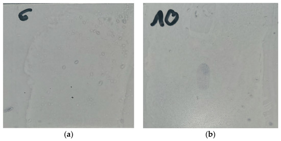 Photos of consequences of inadequate procedures. (a) SC6 left bubbles on the test surface; (b) SC10 left spots on the test surface.