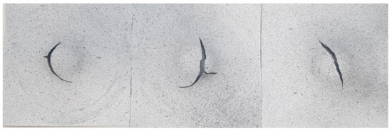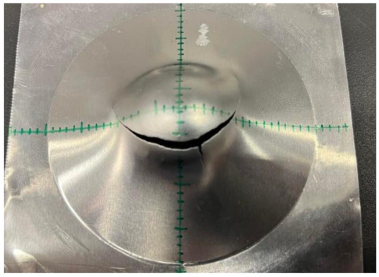 A further task in this study was to optimize the crack location. Because the results showed that even the best three lubricants with Teflon film could not push the crack to the center, the next step was to investigate the layer order of the lubricants. This was worth trying because using the Teflon films allowed the L12, L11, and L5 lubricants to crack near the center. As previous tests showed that 0.08 mm Teflon film gave 1–2% better results than the 0.22 mm film, the following lubricant layering was tested: lubricant + 1 piece 0.08 mm Teflon film + lubricant + 1 piece 0.08 mm Teflon film + lubricant. This layering arrangement only caused a minimal increase in diameter on the punch surface, so measurements could still be made in the standard way. One of the results of the layering test is shown in Figure 6.