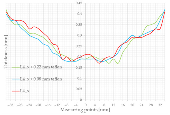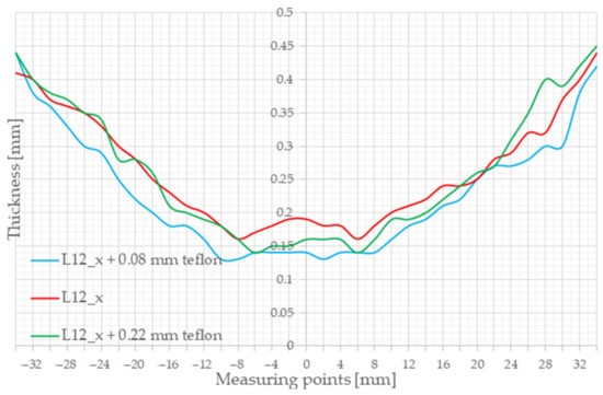 Figure 3 shows the results for sample L12, similar to the previous one, using only the lubricant and the 0.08 mm and 0.22 mm Teflon films. It can be clearly seen that a higher thinning could be achieved by using the L12 lubricant, and Teflon discs could even improve on this value. It can also be observed from the diagram that the thickness minima were not in the middle here either and that there was also a ring-shaped thinning so that the disc flattened at the end of the forming process. The better thinning and higher IE number occurred because the lubricating grease could stay longer between the surfaces, so the flattening occurred later.