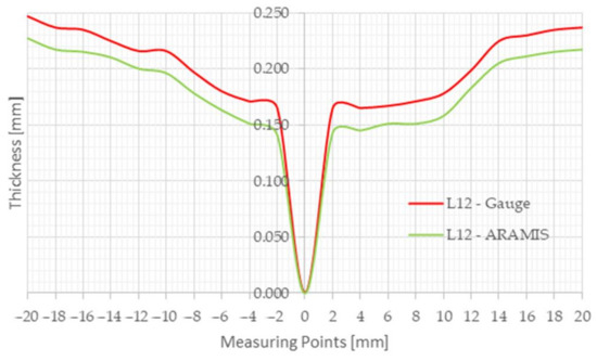 It was essential to check and validate the system before starting the DIC tests. A 0.22 mm thick specimen plate was loaded to crack in the Erichsen machine, while the deformation was recorded with an ARAMIS system. After the measurement, thickness values were extracted from the ARAMIS system along the axis of symmetry perpendicular to the crack, and the thickness deflection curve was recorded on the same test. The results were then compared. Figure 4 shows the validation results. The curves are almost parallel, with differences within a margin of error of 0.02 mm, which is the same as the error of the dial gauge. Based on the results, the ARAMIS system can be considered validated.