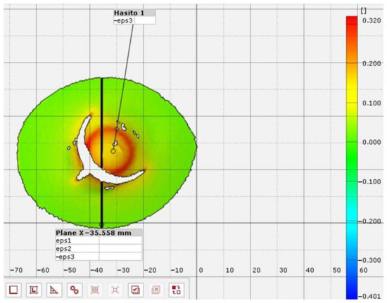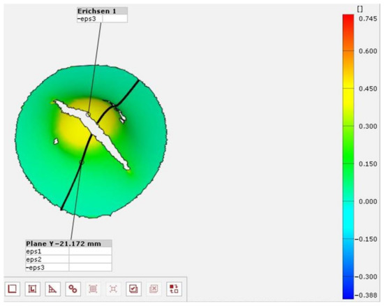 After validation, the recorded images were checked. The test’s purpose was to visualize the details of the forming history. After evaluation of the measurement results, the following typical stress image was obtained. Figure 5 shows the result of the ARAMIS measurement on a 0.22 mm plate with L5 lubricant. The figure clearly shows the thinning in the form of a red ring. The color plot scale represents the thickness reduction in the plates from red (thin) to blue (thick). This pattern was present for all lubricant combinations to varying degrees. The DIC test was able to confirm that the lubricants were displaced, to varying degrees, between the plate and punch at the end of the forming process so that the crack did not appear in the center, i.e., the maximum thinning did not occur at the origin.
