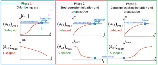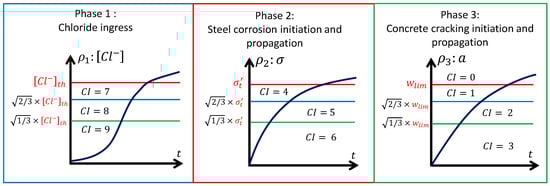 The corrosion process of RC structures is multiphasic. The first conceptual lifecycle model was proposed by Tuutti []. Tuutti’s simplified model discretises the corrosion process into two phases: an initiation phase where chlorides diffuse until reaching their threshold concentration, and a propagation phase where the corrosion reaction takes place. The bi-phasic discretisation can be found in several accumulative pathologies in civil and mechanical engineering, e.g., material cracking within the structural component where in a first phase the damage is not visible to the naked eye, and in a second phase the damage appears to the surface of a component [].
