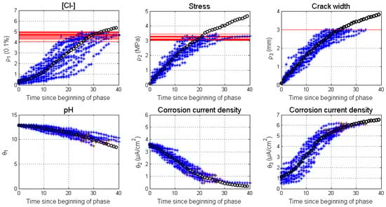 The parameters given in Table 1 are defined as follows: is the concentration of chlorides at the steel interface; is the basicity of the concrete; is the internal tensile stress in concrete, generated by the accumulation of rust products (which have between 2 to 6 times the volume of steel) in the steel concrete interface; is corrosion current density; and is the concrete crack width.
