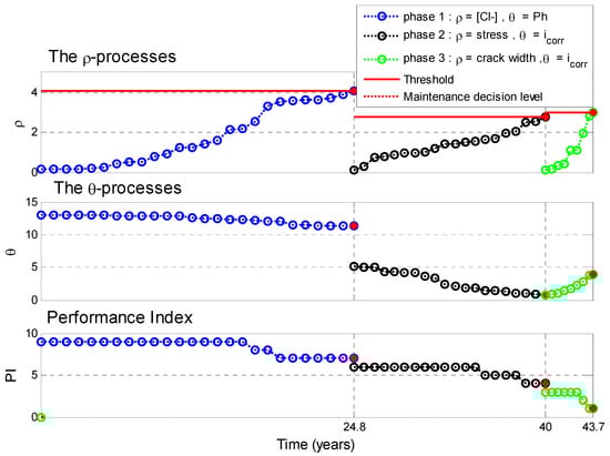 There are n potential indicators that represent every phase. However, we want to restrain the choice to the best ones in terms of their onsite assessment through NDT and SHM, as well as through decision and degradation tracking. We propose to choose two indicators per phase (Table 1). An indicator’s added value in a maintenance-aimed degradation model is in its observability and in the value of information that it gives, especially in terms of the estimation and prediction of the extent of damage. From a classic, mechanist point of view, this approach may be criticized as it leaves out information that is provided by the indicators. However, the proposed model is not a model based on physical models and does not require all the information regarding their multiple parameters (no physical laws are modelled). Instead, it relies on the physical information provided by inspection, by sensors, on the physical understanding of the evolution and kinetics of the underlying degradation processes (e.g., the shape and tendency of the process), as well as their dependencies. Nonetheless, the proposed data-driven model has the Markovian property; as a result, we are propagating both the degradation process and its history. Therefore, the left-out parameters are, in fact, indirectly included in the process [].