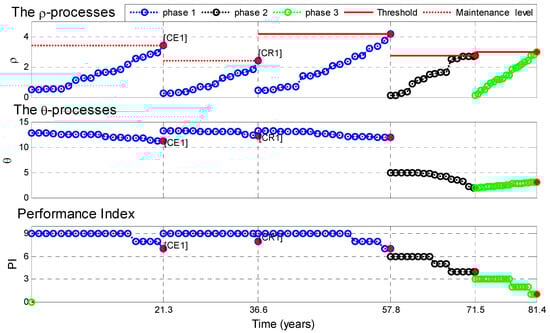Figure 2 illustrates several simulations of the degradation meta-model (blue stars), the mean of these simulations (black circles), the transition thresholds (red lines), and the corresponding values of for a transition in red stars. We can see the agreement between the simulations and the tendencies of the physical indicators, as presented in Figure 1.