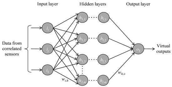 The motivation behind using ANN models for fault detection lies in the capabilities of ANN models to combine complex relationships between sensor data to make predictions. Artificial neural networks are a class of algorithms that use parallel computational principles, inspired by biological nervous systems. The scope of artificial neural networks covers tasks that are difficult to solve with deterministic algorithms or classical physics-based models, for example nonlinear problems, such as the diagnosis of sensor faults [11]. To present the methodology of the AFDAR approach, the topology of an exemplary ANN model is shown in Figure 1. In general, each ANN model has an input layer, one or several hidden layers, and an output layer. The input layer encompasses the input neurons, to which input data are fed. Since the purpose of each ANN model is to predict the sensor data of a single sensor using correlated data from neighboring sensors (hereinafter termed “correlated sensors”), the sensor data from the correlated sensors are used as input data. Each hidden layer ℓ is formed by neurons that receive weighted combinations w of the outputs of neurons (“activations”) belonging to the preceding layer ℓ-1, to which the neurons of layer ℓ are connected via arrows, termed “synapses”. Each activation of layer ℓ is computed through an “activation function”, which is applied when the input of a neuron exceeds a threshold. The last hidden layer forwards its activations to the output layer, which yields the predictions of the ANN model, i.e., in this study, the virtual outputs of a single sensor.