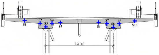 A SHM system was installed on the bridge consisting of temperature sensors, displacement transducers, potentiometers, and strain gauges. In general, sensor faults have the same mechanisms and nature, regardless of the sensor type. In other words, deviations in sensor data from strain gauges, caused by drift, gain, bias or complete failure, follow the same patterns as deviations in sensor data from temperature sensors. As a result, for the sake of brevity and simplicity in the validation test, the sensor data from 10 temperature sensors were used, which were embedded in the RC slab in the positions depicted in Figure 3 (S1, …, S10). The temperature sensors were of type Pt100, measuring at a range from −35 °C to 105 °C with a sensitivity of ± 0.5°C. The sensor data recorded by the temperature sensors was transferred to a central computer, where it was processed and stored.