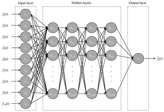 A total of 10 ANN models, equal to the number of correlated sensors (k = 10), were trained. Each model predicted the virtual outputs of one sensor, using temperature measurements from the other nine correlated sensors in the SHM system as input data. As a result, each ANN model had nine input neurons and one output neuron; the number of hidden layers and neurons per hidden layer was determined with different ANN architectures. Before training the ANN models for FD, the temperature measurements were split into training and testing sets. An ANN with a 9-32-64-256-256-1 architecture was determined for all ANN models, based on the lowest RMSE values ε, which lay between 0.09 and 0.15, with a total training time of approximately 680 s for each ANN model. The fault detection threshold was set to γ = 0.15, based upon engineering judgment. Exemplarily, Figure 4 illustrates the architecture of the ANN model M1, predicting the virtual outputs (t) for sensor S1 using temperature measurements from correlated sensors f2→10(t) as input data. With the training of the 10 ANN models, the initialization phase was completed, and the remaining steps of the AFDAR approach, i.e., fault detection, fault isolation and fault accommodation, were executed separately for each validation test.