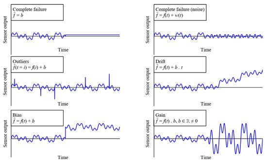 However, the reliability and performance of SHM systems, besides the proper synchronization of sensors [6], depend on the accurate operation of the sensing equipment. Sensors in monitoring systems may experience faults, compromising the reliability and performance of SHM systems. Sensor faults may be caused by hardware or software malfunctions, power outages, environmental impacts, or signal interferences [7]. The most common sensor faults include bias, complete failure, complete failure with noise, gain, drift, and outliers [8]. If undetected, sensor faults may compromise the accuracy of the sensing equipment, resulting in the low reliability and poor performance of SHM systems.