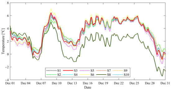 As depicted in Figure 8, from December 5, data recorded by sensor S8, represented with the green continuous line, started deviating from the data recorded by the other sensors. The deviation in the data recorded by sensor S8 may be attributed to a drift occurring in the sensor. Furthermore, in the figure, between December 19 and December 20, no data were recorded by sensor S3, which may be attributed to a complete failure of the sensor.