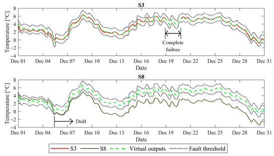 The faults occurring simultaneously in sensors S3 and S8 were detected by the AFDAR approach, as the recorded temperature measurements exceeded the fault detection threshold, as shown in Figure 9. The figure shows data recorded by sensors S3 (top, continuous red line) and S8 (bottom, continuous green line). The dashed green line shows the virtual outputs of the ANN models, and the dotted black lines represent the fault detection thresholds. It should be noted that a total of 274 simultaneous faults occurred in sensors S3 and S8 between December 19 and December 20; however, the focus was drawn only on simultaneous faults that occurred in the aforementioned period, which fall within the scope of this paper.