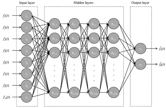 In the final step, fault accommodation, temperature measurements recorded by the faulty sensors S1 and S2, f1(to ≥ 101) and f2(to ≥ 101), could not be replaced with the virtual outputs (to ≥ 101) and (to ≥ 101), respectively, because temperature measurements recorded by sensor S1 f1(to ≥ 101) were used as an input for model M2, which would result in the contamination of the virtual output (to ≥ 101), and vice versa. Consequently, both models M1 and M2 were adapted to this simultaneous fault by modifying the architecture of the ANN models M1 and M2. Thus, temperature measurements from S1 and S2 were shifted from the ANN input layer of models M1 and M2 to the output layer, and data prior to to = 101 min was used to train the adapted model M1,2. Figure 6 illustrates the architecture of the adapted ANN model, M1,2, predicting the virtual outputs and for both sensors, S1 and S2.