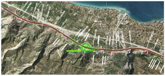 The above procedure produced a CAD drawing, as presented in Figure 1, with georeferenced satellite images as the background, including motorway centerline geometry, chainage, speed limits, and visualization of other important road infrastructure elements: toll stations, interchanges (with transverse roads, entrance and exit ramps), km posts, location of lane addition or lane drop, weaving segments, etc., and a Google Earth Dataset in .kmz file form, presented in Figure 2, with several layers of information: centerline, chainage, tunnels, additional lane points (gore, start, and end), lane drops/additions, etc. These two powerful tools were utilized in order to code road infrastructure data for further analysis and create a database that forms the basis for subsequent analysis.